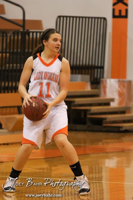 Larned Lady Indian Reagan Quick (#11) looks for a teammate to pass the ball to during the Larned Lady Indians versus Kiowa County Lady Mavericks First Round Game with Larned winning 50 to 39 at the 6th Annual Keady Basketball Classic held at Larned Middle School in Larned, Kansas on December 3, 2012. (Photo: Joey Bahr, www.joeybahr.com)
