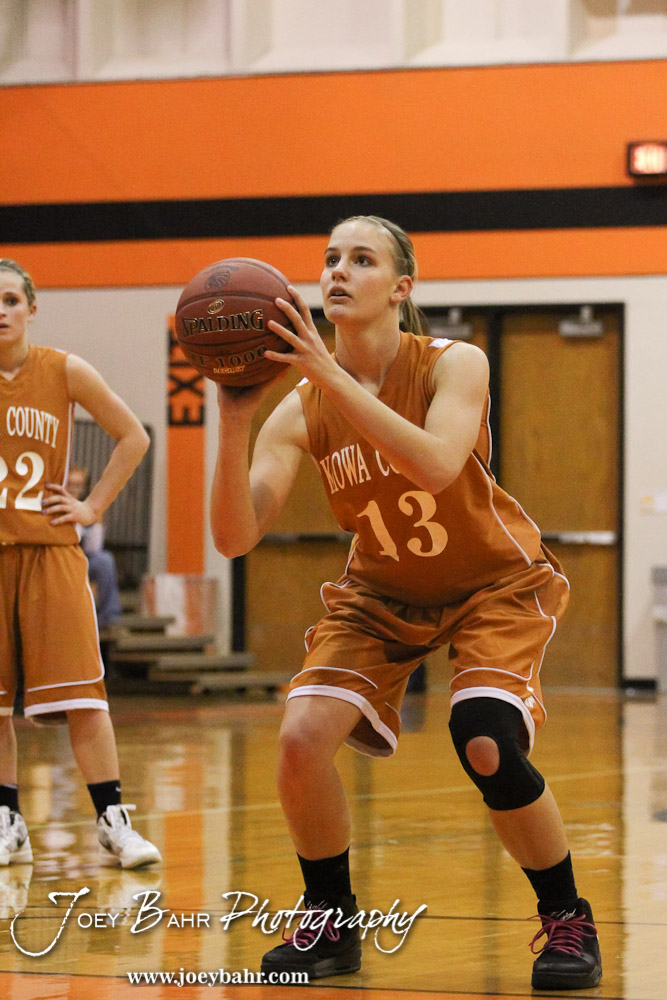 Kiowa County Lady Maverick Heather Melton (#13) shoots a free throw attempt during the Larned Lady Indians versus Kiowa County Lady Mavericks First Round Game with Larned winning 50 to 39 at the 6th Annual Keady Basketball Classic held at Larned Middle School in Larned, Kansas on December 3, 2012. (Photo: Joey Bahr, www.joeybahr.com)