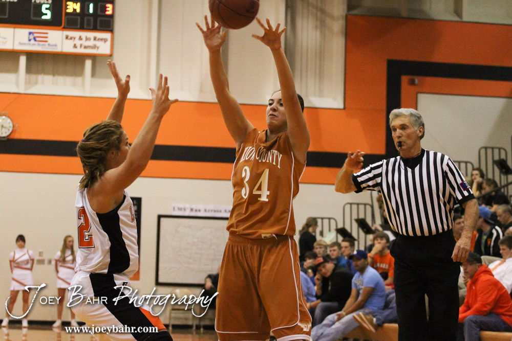 Kiowa County Lady Maverick Dena Liggett (#34) throws an inbounds pass during the Larned Lady Indians versus Kiowa County Lady Mavericks First Round Game with Larned winning 50 to 39 at the 6th Annual Keady Basketball Classic held at Larned Middle School in Larned, Kansas on December 3, 2012. (Photo: Joey Bahr, www.joeybahr.com)