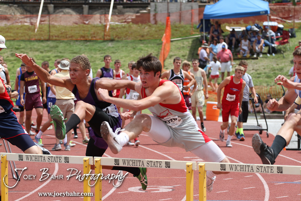 Adam Oak of Macksville leaps over a hurdle in the Preliminaries of the Class 1A Boys 110 Meter High Hurdles during the 2012 KSHSAA State Track and Field Championship at Cessna Stadium on the campus of Wichita State University in Wichita, Kansas on May 25, 2012. (Photo: Joey Bahr, www.joeybahr.com)