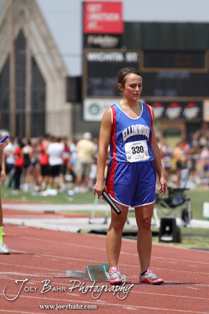 Chelsea Day of Ellinwood waits for the next command in the Preliminaries of the Class 2A Girls 4×100 Meter Relay during the 2012 KSHSAA State Track and Field Championship at Cessna Stadium on the campus of Wichita State University in Wichita, Kansas on May 25, 2012. (Photo: Joey Bahr, www.joeybahr.com)