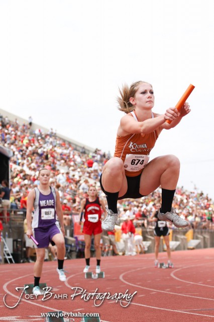 Kiowa County’s Katelynn Gamble loosens up for the First Leg of the Class 2A Girls 4×100 Meter Relay Preliminaries during the 2012 KSHSAA State Track and Field Championship at Cessna Stadium on the campus of Wichita State University in Wichita, Kansas on May 25, 2012. (Photo: Joey Bahr, www.joeybahr.com)