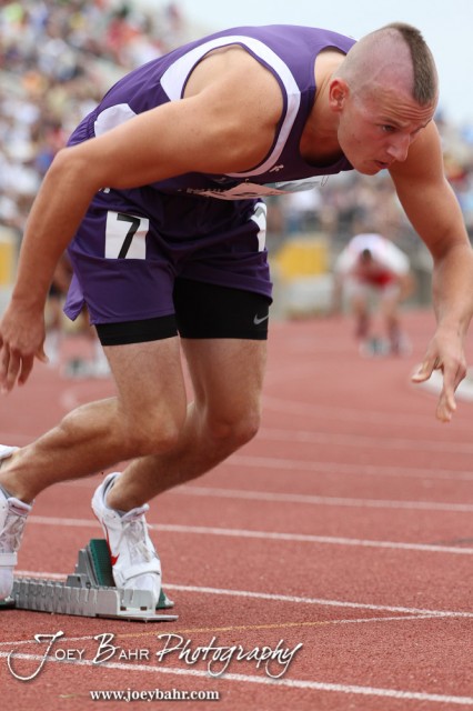 Robert Maertens of Lousiburg starts his 400 Meter Dash in Class 4A during the 2012 KSHSAA State Track and Field Championship at Cessna Stadium on the campus of Wichita State University in Wichita, Kansas on May 25, 2012. (Photo: Joey Bahr, www.joeybahr.com)