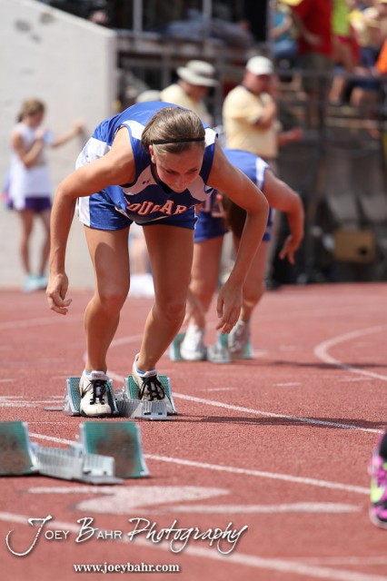 Hannah Bannister of Otis-Bison launches out of the starting blocks in the Preliminaries of the Class 1A Girls 400 Meter Dash during the 2012 KSHSAA State Track and Field Championship at Cessna Stadium on the campus of Wichita State University in Wichita, Kansas on May 25, 2012. (Photo: Joey Bahr, www.joeybahr.com)
