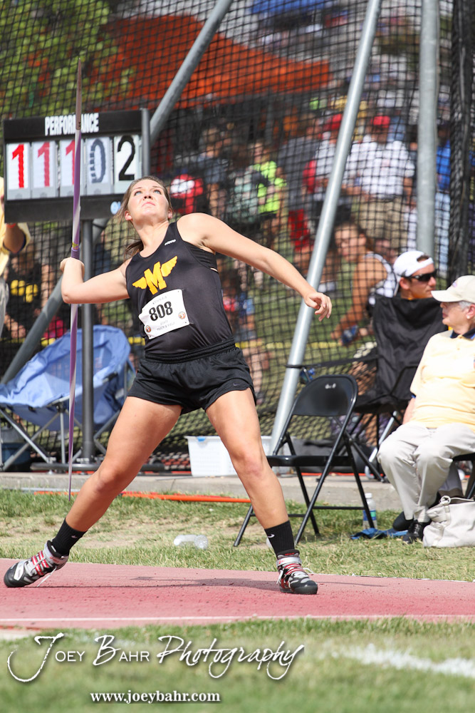 Tyler Farthing of Madison throws in the Class 1A Girls Javelin during the 2012 KSHSAA State Track and Field Championship at Cessna Stadium on the campus of Wichita State University in Wichita, Kansas on May 25, 2012. (Photo: Joey Bahr, www.joeybahr.com)