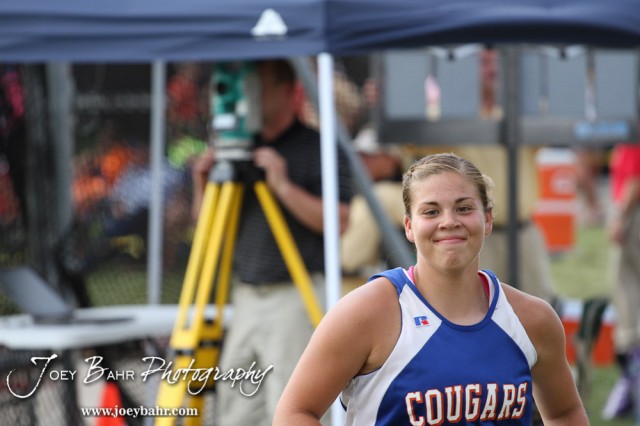 Otis-Bison’s Janel Tammen smiles after a good throw in the Class 1A Girls Discuss during the 2012 KSHSAA State Track and Field Championship at Cessna Stadium on the campus of Wichita State University in Wichita, Kansas on May 25, 2012. (Photo: Joey Bahr, www.joeybahr.com)