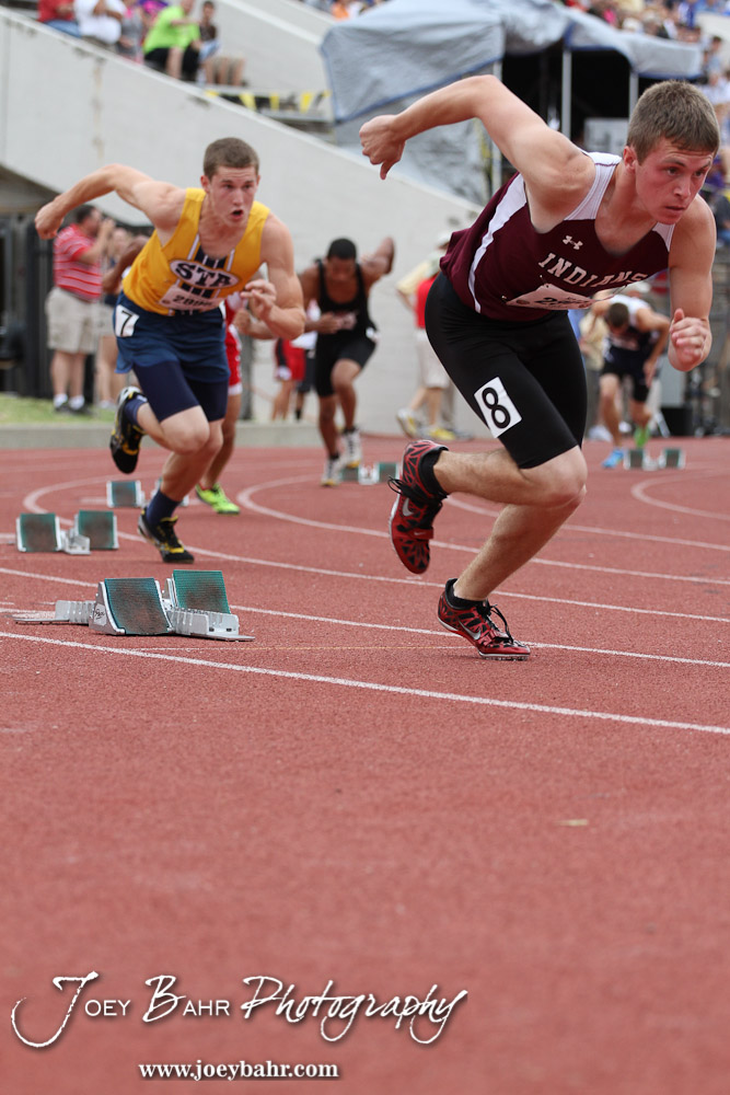 Shawn Herrman of Hays and Dillon Moran of St. Thomas Aquinas leave the starting blocks in the 5A Boys 400 Meter Dash during the 2012 KSHSAA State Track and Field Championship at Cessna Stadium on the campus of Wichita State University in Wichita, Kansas on May 25, 2012. (Photo: Joey Bahr, www.joeybahr.com)