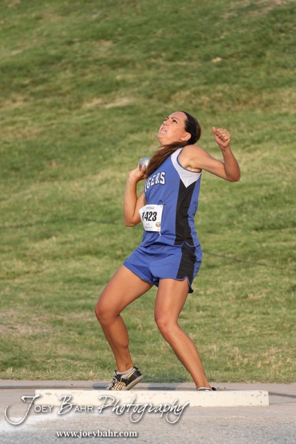 St John-Hudson High School’s Teresa Wade throws in the Class 1A Girls Shot Put during the 2012 KSHSAA State Track and Field Championship at Cessna Stadium on the campus of Wichita State University in Wichita, Kansas on May 25, 2012. (Photo: Joey Bahr, www.joeybahr.com)
