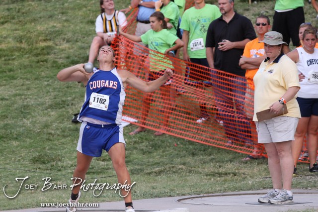 Otis-Bison’s Janel Tammen throws in the Class 1A Girls Shot Put during the 2012 KSHSAA State Track and Field Championship at Cessna Stadium on the campus of Wichita State University in Wichita, Kansas on May 25, 2012. (Photo: Joey Bahr, www.joeybahr.com)