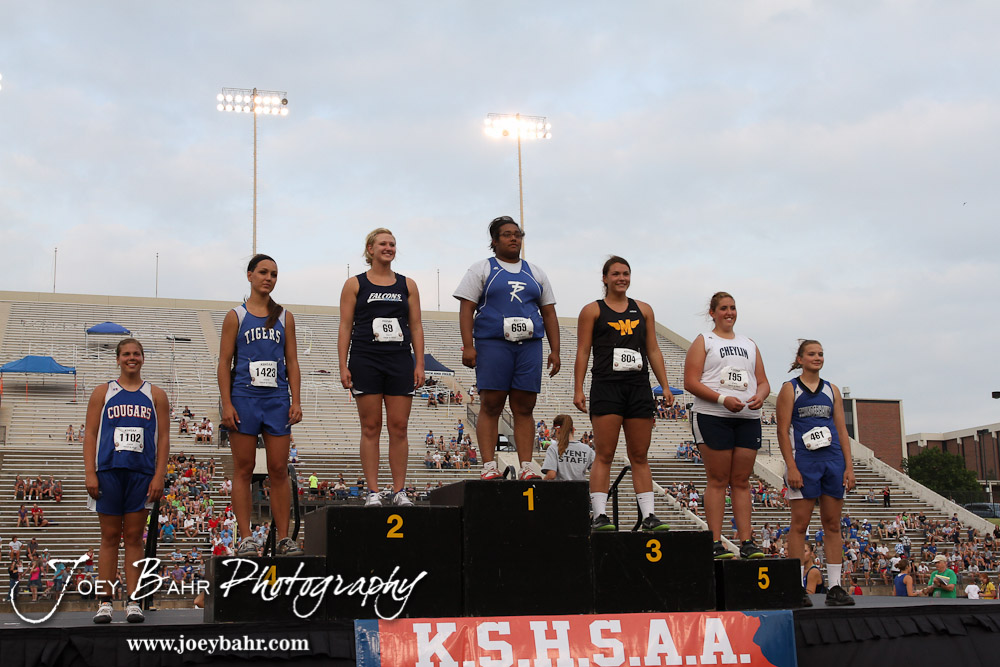 Winners of the Class 1A Girls Shot Put pose on the podium after receiving their medals during the 2012 KSHSAA State Track and Field Championship at Cessna Stadium on the campus of Wichita State University in Wichita, Kansas on May 25, 2012. (Photo: Joey Bahr, www.joeybahr.com)