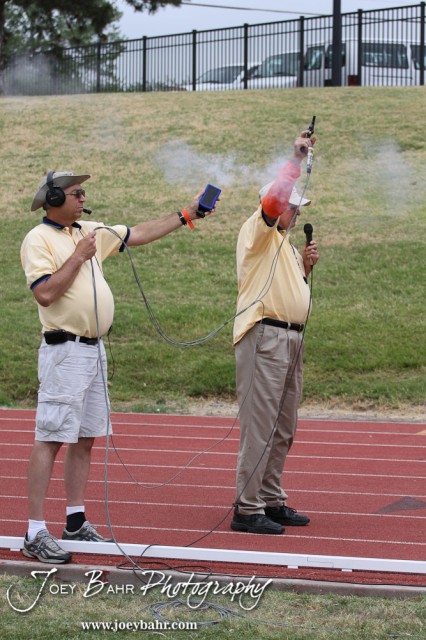 The starter fires his gun at the start of a heat during the 2012 KSHSAA State Track and Field Championship at Cessna Stadium on the campus of Wichita State University in Wichita, Kansas on May 25, 2012. (Photo: Joey Bahr, www.joeybahr.com)