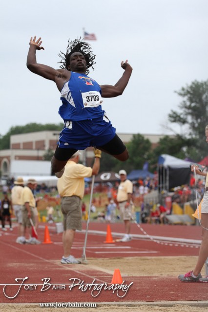 Wichita South’s Davonte Harris leaps in the Class 6A Boys Long Jump during the 2012 KSHSAA State Track and Field Championship at Cessna Stadium on the campus of Wichita State University in Wichita, Kansas on May 25, 2012. (Photo: Joey Bahr, www.joeybahr.com)
