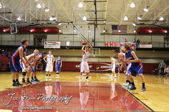 Otis-Bison Cougar Justus Bartonek (#3) shoots a free throw during the Otis-Bison versus Ellinwood First Round game with Ellinwood winning 47 to 45 at the 2013 Hoisington Winter Jam held at Hoisington Activity Center in Hoisington, Kansas on January 14, 2013. (Photo: Joey Bahr, www.joeybahr.com)