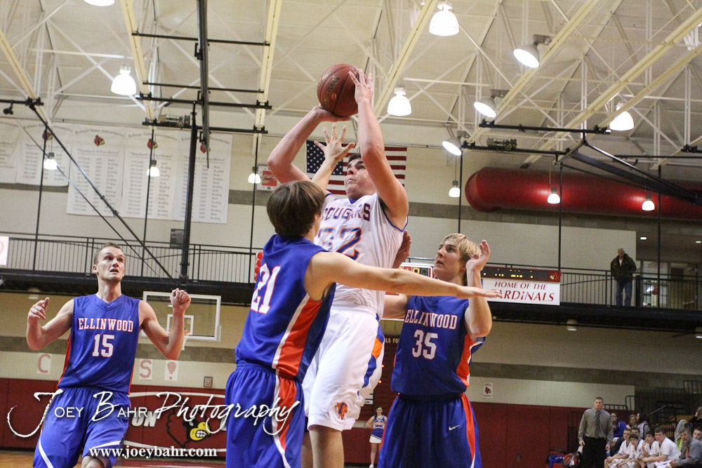 Otis-Bison Cougar Tyler Maier (#32) shoots over the defense of Ellinwood Eagles Kyle Jenks (#21) and Gavin Vink (#35) during the Otis-Bison versus Ellinwood First Round game with Ellinwood winning 47 to 45 at the 2013 Hoisington Winter Jam held at Hoisington Activity Center in Hoisington, Kansas on January 14, 2013. (Photo: Joey Bahr, www.joeybahr.com)