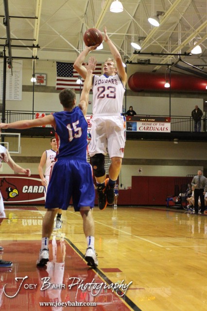 Otis-Bison Cougar Jordan Hoffman (#23) goes up for a shot over Ellinwood Eagle Kyle Blakeslee (#15) during the Otis-Bison versus Ellinwood First Round game with Ellinwood winning 47 to 45 at the 2013 Hoisington Winter Jam held at Hoisington Activity Center in Hoisington, Kansas on January 14, 2013. (Photo: Joey Bahr, www.joeybahr.com)