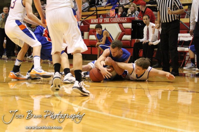 Ellinwood Eagle Kyle Blakeslee (#15) and Otis-Bison Cougar Dylan Wissman (#11) battle for a loose ball during the Otis-Bison versus Ellinwood First Round game with Ellinwood winning 47 to 45 at the 2013 Hoisington Winter Jam held at Hoisington Activity Center in Hoisington, Kansas on January 14, 2013. (Photo: Joey Bahr, www.joeybahr.com)