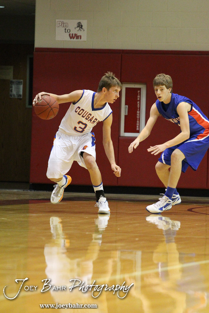 Otis-Bison Cougar Justus Bartonek (#3) looks to make a move as Ellinwood Eagle Marc Waite (#4) defends during the Otis-Bison versus Ellinwood First Round game with Ellinwood winning 47 to 45 at the 2013 Hoisington Winter Jam held at Hoisington Activity Center in Hoisington, Kansas on January 14, 2013. (Photo: Joey Bahr, www.joeybahr.com)