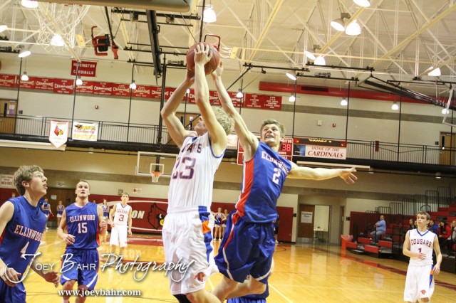Ellinwood Eagle Patrick Ringering (#2) tries to swipe the ball from a shooting Otis-Bison Cougar Jordan Hoffman (#23) during the Otis-Bison versus Ellinwood First Round game with Ellinwood winning 47 to 45 at the 2013 Hoisington Winter Jam held at Hoisington Activity Center in Hoisington, Kansas on January 14, 2013. (Photo: Joey Bahr, www.joeybahr.com)