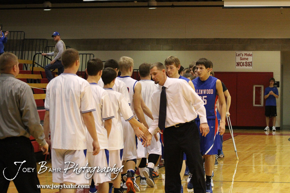 Members of the two team shake hands following the Otis-Bison versus Ellinwood First Round game with Ellinwood winning 47 to 45 at the 2013 Hoisington Winter Jam held at Hoisington Activity Center in Hoisington, Kansas on January 14, 2013. (Photo: Joey Bahr, www.joeybahr.com)