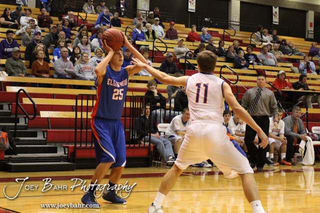 Ellinwood Eagle Derek Ward (#25) takes a shot while Otis-Bison Cougar Dylan Wissman (#11) defends during the Otis-Bison versus Ellinwood First Round game with Ellinwood winning 47 to 45 at the 2013 Hoisington Winter Jam held at Hoisington Activity Center in Hoisington, Kansas on January 14, 2013. (Photo: Joey Bahr, www.joeybahr.com)