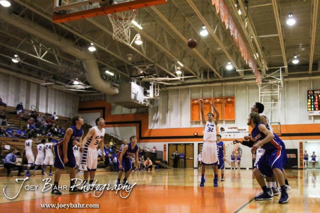 St. John Tiger Dean Wade (#32) shoots a free throw attempt during the Opening Round of the Seventh Annual Keady Basketball Classic matchup between the Ellinwood Eagles and the St. John Tigers with St. John winning 76 to 23 at Larned Middle School in Larned, Kansas on December 9, 2013. (Photo: Joey Bahr, www.joeybahr.com)