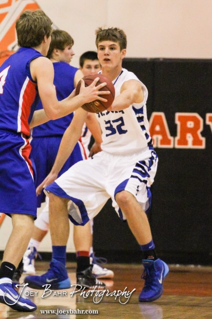 St. John Tiger Dean Wade (#32) defends during the Opening Round of the Seventh Annual Keady Basketball Classic matchup between the Ellinwood Eagles and the St. John Tigers with St. John winning 76 to 23 at Larned Middle School in Larned, Kansas on December 9, 2013. (Photo: Joey Bahr, www.joeybahr.com)