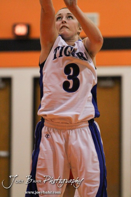 St. John Lady Tiger Tia Smith (#3) shoots a free throw attempt during the Opening Round of the Seventh Annual Keady Basketball Classic matchup between the Ellinwood Lady Eagles and the St. John Lady Tigers with Ellinwood winning 40 to 38 in overtime at Larned Middle School in Larned, Kansas on December 9, 2013. (Photo: Joey Bahr, www.joeybahr.com)