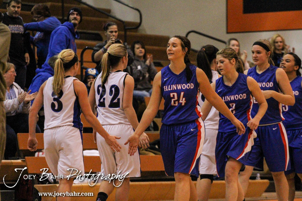 Members of the St. John Lady Tigers and Ellinwood Lady Eagles shake hands following the Opening Round of the Seventh Annual Keady Basketball Classic matchup between the Ellinwood Lady Eagles and the St. John Lady Tigers with Ellinwood winning 40 to 38 in overtime at Larned Middle School in Larned, Kansas on December 9, 2013. (Photo: Joey Bahr, www.joeybahr.com)