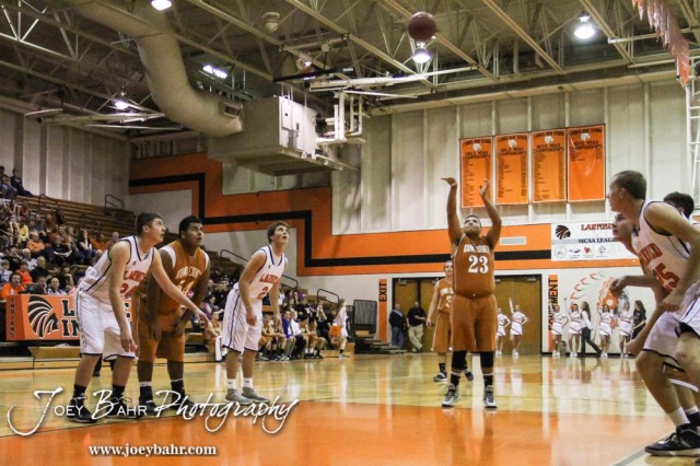 Kiowa County Maverick Michael Tedder (#23) shoots a free throw attempt during the Opening Round of the Seventh Annual Keady Basketball Classic matchup between the Kiowa County Mavericks and the Larned Indians with Larned winning 67 to 40 at Marvin Webster Court in Larned, Kansas on December 10, 2013. (Photo: Joey Bahr, www.joeybahr.com)