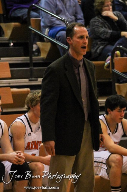 Larned Indians Head Coach Tricia Prescott calls out a play to his players during the Opening Round of the Seventh Annual Keady Basketball Classic matchup between the Kiowa County Mavericks and the Larned Indians with Larned winning 67 to 40 at Marvin Webster Court in Larned, Kansas on December 10, 2013. (Photo: Joey Bahr, www.joeybahr.com)