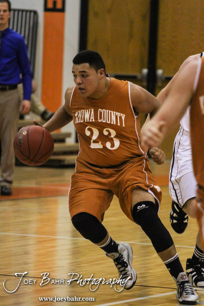 Kiowa County Maverick Michael Tedder (#23) drives the ball down the court during the Opening Round of the Seventh Annual Keady Basketball Classic matchup between the Kiowa County Mavericks and the Larned Indians with Larned winning 67 to 40 at Marvin Webster Court in Larned, Kansas on December 10, 2013. (Photo: Joey Bahr, www.joeybahr.com)