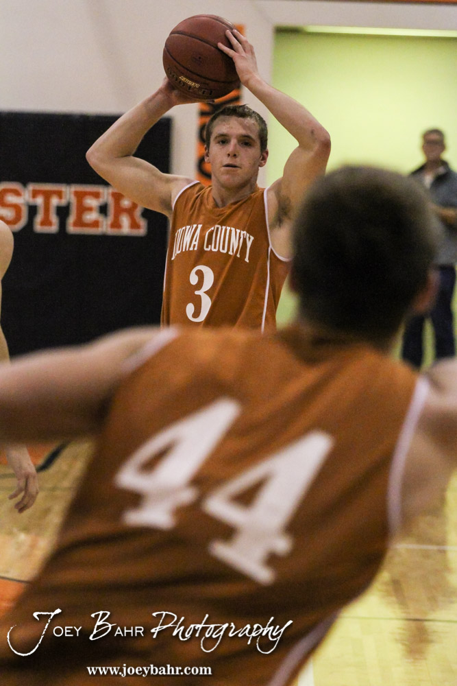 Kiowa County Maverick Trever Powell (#3) looks for an open teammate to pass the ball to during the Opening Round of the Seventh Annual Keady Basketball Classic matchup between the Kiowa County Mavericks and the Larned Indians with Larned winning 67 to 40 at Marvin Webster Court in Larned, Kansas on December 10, 2013. (Photo: Joey Bahr, www.joeybahr.com)