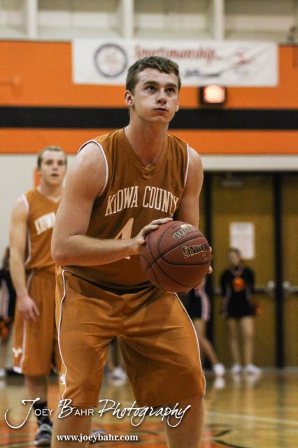 Kiowa County Maverick John Terhune (#44) prepares to shoot a free throw attempt during the Opening Round of the Seventh Annual Keady Basketball Classic matchup between the Kiowa County Mavericks and the Larned Indians with Larned winning 67 to 40 at Marvin Webster Court in Larned, Kansas on December 10, 2013. (Photo: Joey Bahr, www.joeybahr.com)