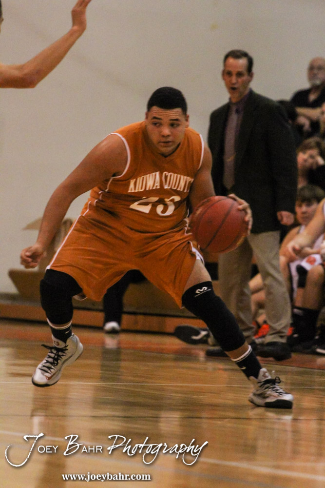 Kiowa County Maverick Michael Tedder (#23) cuts with the ball during the Opening Round of the Seventh Annual Keady Basketball Classic matchup between the Kiowa County Mavericks and the Larned Indians with Larned winning 67 to 40 at Marvin Webster Court in Larned, Kansas on December 10, 2013. (Photo: Joey Bahr, www.joeybahr.com)