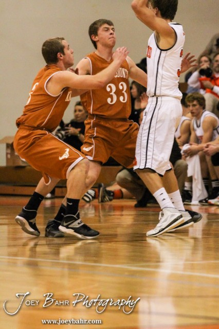 Kiowa County Mavericks Trever Powell (#3) and Cole Kendall (#33) close in on a Larned Indian during the Opening Round of the Seventh Annual Keady Basketball Classic matchup between the Kiowa County Mavericks and the Larned Indians with Larned winning 67 to 40 at Marvin Webster Court in Larned, Kansas on December 10, 2013. (Photo: Joey Bahr, www.joeybahr.com)