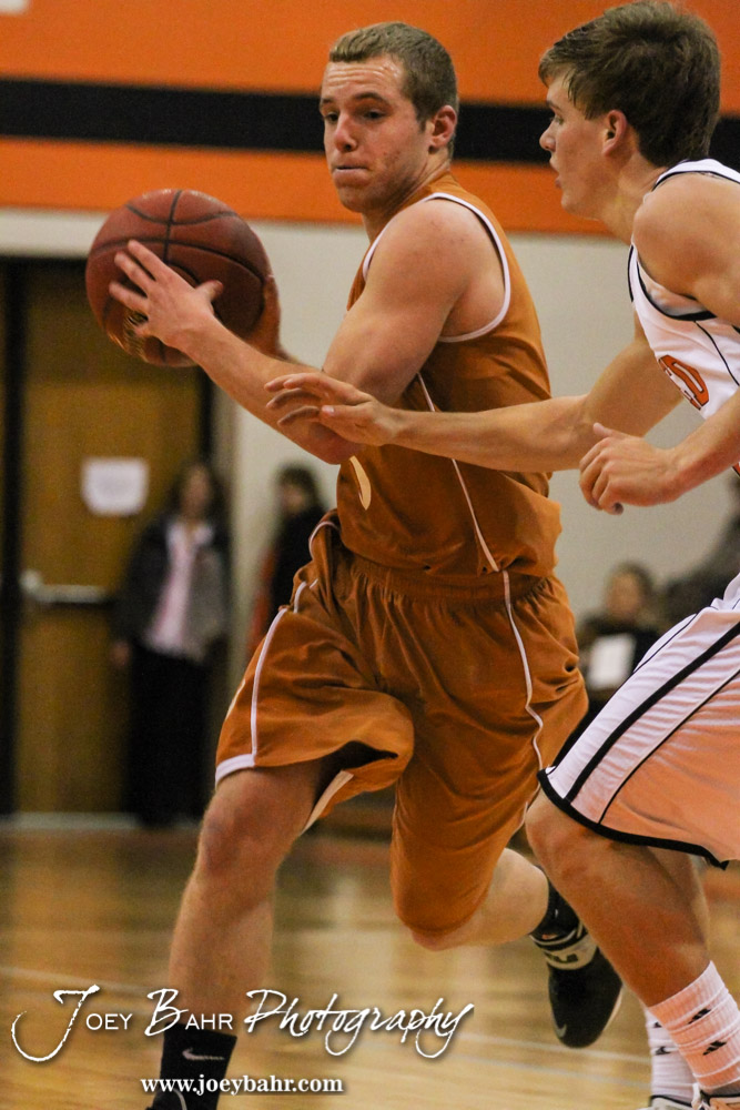 Kiowa County Maverick Trever Powell (#3) drives past Larned Indian Brayden Smith (#3) during the Opening Round of the Seventh Annual Keady Basketball Classic matchup between the Kiowa County Mavericks and the Larned Indians with Larned winning 67 to 40 at Marvin Webster Court in Larned, Kansas on December 10, 2013. (Photo: Joey Bahr, www.joeybahr.com)