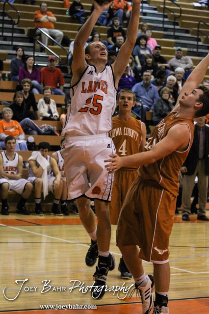 Larned Indian Michael Reece (#25) goes up for a layup during the Opening Round of the Seventh Annual Keady Basketball Classic matchup between the Kiowa County Mavericks and the Larned Indians with Larned winning 67 to 40 at Marvin Webster Court in Larned, Kansas on December 10, 2013. (Photo: Joey Bahr, www.joeybahr.com)