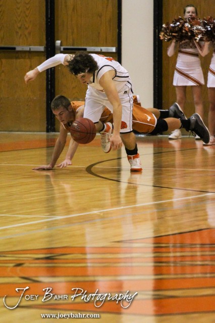 Larned Indian Tyler Stelter (#10) scrambles for a loose ball during the Opening Round of the Seventh Annual Keady Basketball Classic matchup between the Kiowa County Mavericks and the Larned Indians with Larned winning 67 to 40 at Marvin Webster Court in Larned, Kansas on December 10, 2013. (Photo: Joey Bahr, www.joeybahr.com)