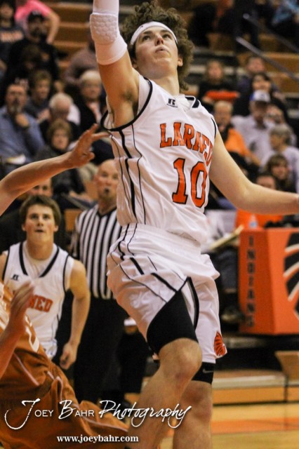 Larned Indian Tyler Stelter (#10) goes up for a layup during the Opening Round of the Seventh Annual Keady Basketball Classic matchup between the Kiowa County Mavericks and the Larned Indians with Larned winning 67 to 40 at Marvin Webster Court in Larned, Kansas on December 10, 2013. (Photo: Joey Bahr, www.joeybahr.com)
