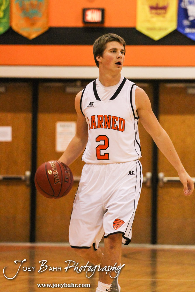 Larned Indian Easton Palmer (#2) carries the ball down the court during the Opening Round of the Seventh Annual Keady Basketball Classic matchup between the Kiowa County Mavericks and the Larned Indians with Larned winning 67 to 40 at Marvin Webster Court in Larned, Kansas on December 10, 2013. (Photo: Joey Bahr, www.joeybahr.com)
