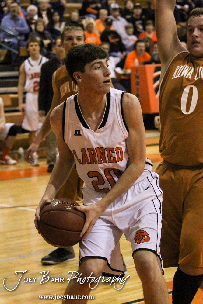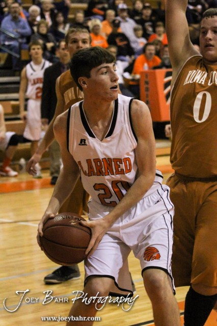 Larned Indian Trey Kraisinger (#20) looks for a teammate to pass the ball to during the Opening Round of the Seventh Annual Keady Basketball Classic matchup between the Kiowa County Mavericks and the Larned Indians with Larned winning 67 to 40 at Marvin Webster Court in Larned, Kansas on December 10, 2013. (Photo: Joey Bahr, www.joeybahr.com)