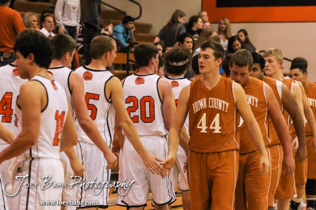 Members of the Larned Indians and Kiowa County Mavericks shake hands following the Opening Round of the Seventh Annual Keady Basketball Classic matchup between the Kiowa County Mavericks and the Larned Indians with Larned winning 67 to 40 at Marvin Webster Court in Larned, Kansas on December 10, 2013. (Photo: Joey Bahr, www.joeybahr.com)