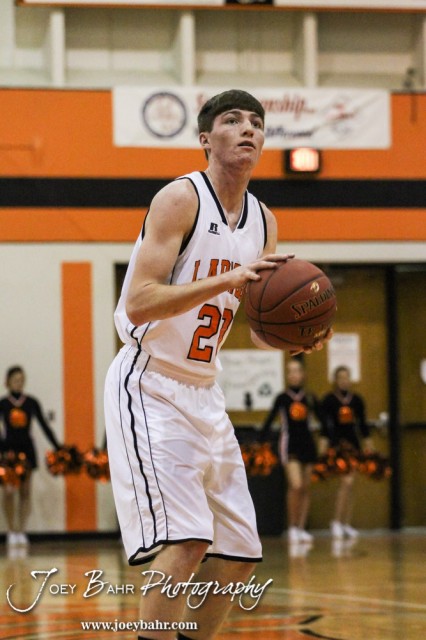 Larned Indian Trey Kraisinger (#20) shoots a free throw attempt during the Opening Round of the Seventh Annual Keady Basketball Classic matchup between the Kiowa County Mavericks and the Larned Indians with Larned winning 67 to 40 at Marvin Webster Court in Larned, Kansas on December 10, 2013. (Photo: Joey Bahr, www.joeybahr.com)