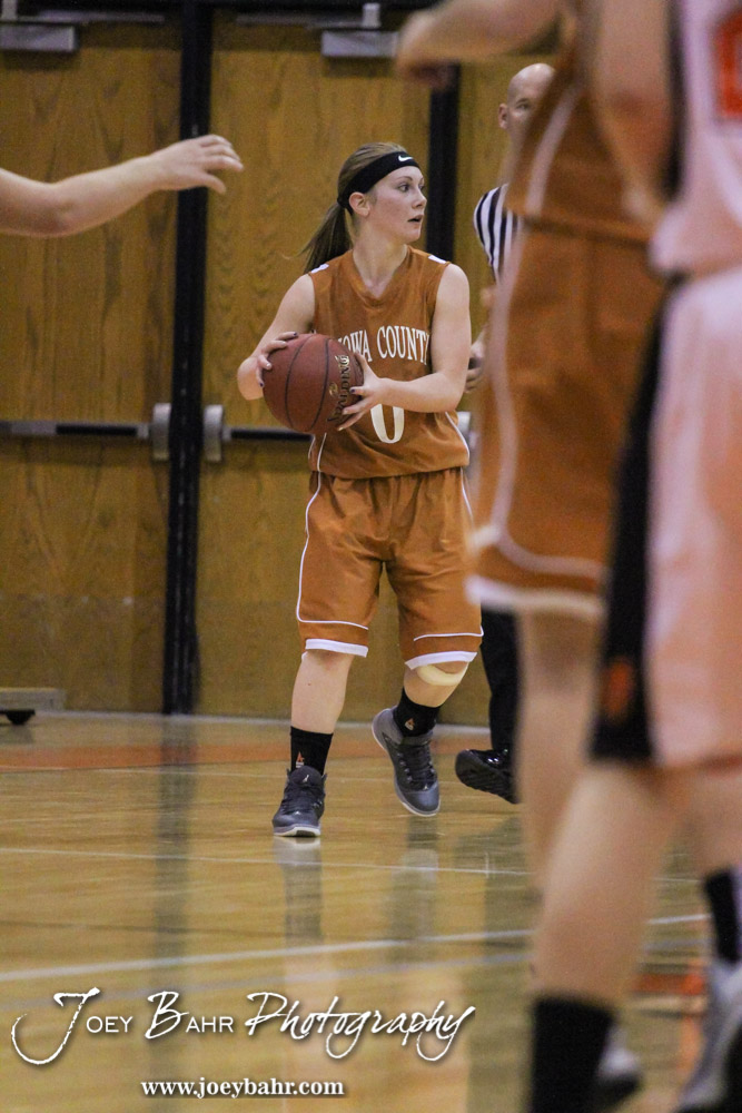 Kiowa County Lady Maverick Katelynn Gamble (#0) looks for a teammate to pass to during the Opening Round of the Seventh Annual Keady Basketball Classic matchup between the Kiowa County Lady Mavericks and the Larned Lady Indians with Kiowa County winning 34 to 19 at Marvin Webster Court in Larned, Kansas on December 10, 2013. (Photo: Joey Bahr, www.joeybahr.com)
