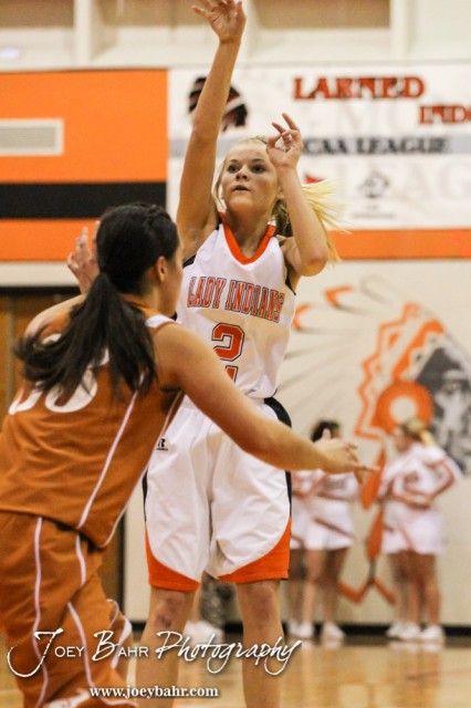 Larned Lady Indian Allison Aldrich (#2) takes a shot during the Opening Round of the Seventh Annual Keady Basketball Classic matchup between the Kiowa County Lady Mavericks and the Larned Lady Indians with Kiowa County winning 34 to 19 at Marvin Webster Court in Larned, Kansas on December 10, 2013. (Photo: Joey Bahr, www.joeybahr.com)