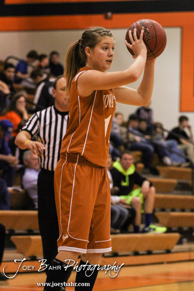 Kiowa County Lady Maverick Nicole Ballard (#14) looks for a teammate to pass the ball to during the Opening Round of the Seventh Annual Keady Basketball Classic matchup between the Kiowa County Lady Mavericks and the Larned Lady Indians with Kiowa County winning 34 to 19 at Marvin Webster Court in Larned, Kansas on December 10, 2013. (Photo: Joey Bahr, www.joeybahr.com)