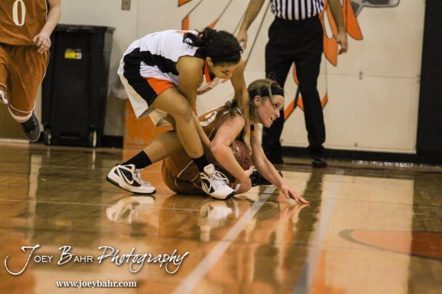 Larned Lady Indian Shaylene Shepard (#3) tries to pull the ball away from Kiowa County Lady Maverick Riann Heft (#22) during the Opening Round of the Seventh Annual Keady Basketball Classic matchup between the Kiowa County Lady Mavericks and the Larned Lady Indians with Kiowa County winning 34 to 19 at Marvin Webster Court in Larned, Kansas on December 10, 2013. (Photo: Joey Bahr, www.joeybahr.com)