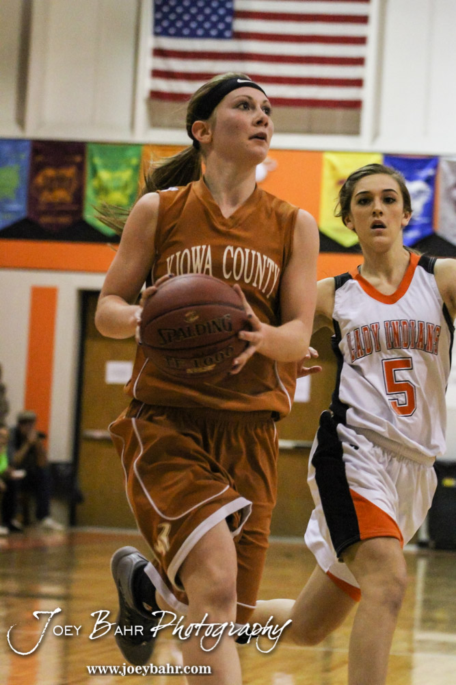 Kiowa County Lady Maverick Katelynn Gamble (#0) drives to the basket during the Opening Round of the Seventh Annual Keady Basketball Classic matchup between the Kiowa County Lady Mavericks and the Larned Lady Indians with Kiowa County winning 34 to 19 at Marvin Webster Court in Larned, Kansas on December 10, 2013. (Photo: Joey Bahr, www.joeybahr.com)