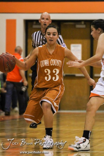 Kiowa County Lady Maverick Dena Liggett (#33) drives down the court with the ball during the Opening Round of the Seventh Annual Keady Basketball Classic matchup between the Kiowa County Lady Mavericks and the Larned Lady Indians with Kiowa County winning 34 to 19 at Marvin Webster Court in Larned, Kansas on December 10, 2013. (Photo: Joey Bahr, www.joeybahr.com)