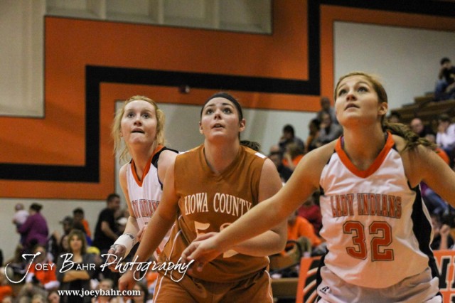 Larned Lady Indian Roxy Foster (#4) and Kiowa County Lady Maverick McKenzie Heft (#52) watch the ball fly during the Opening Round of the Seventh Annual Keady Basketball Classic matchup between the Kiowa County Lady Mavericks and the Larned Lady Indians with Kiowa County winning 34 to 19 at Marvin Webster Court in Larned, Kansas on December 10, 2013. (Photo: Joey Bahr, www.joeybahr.com)